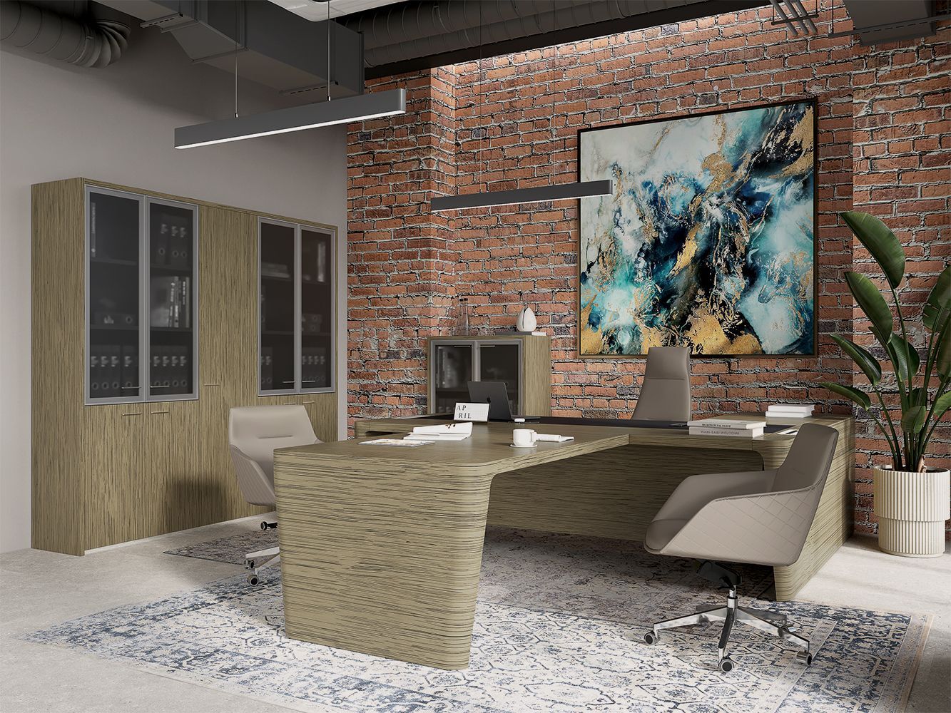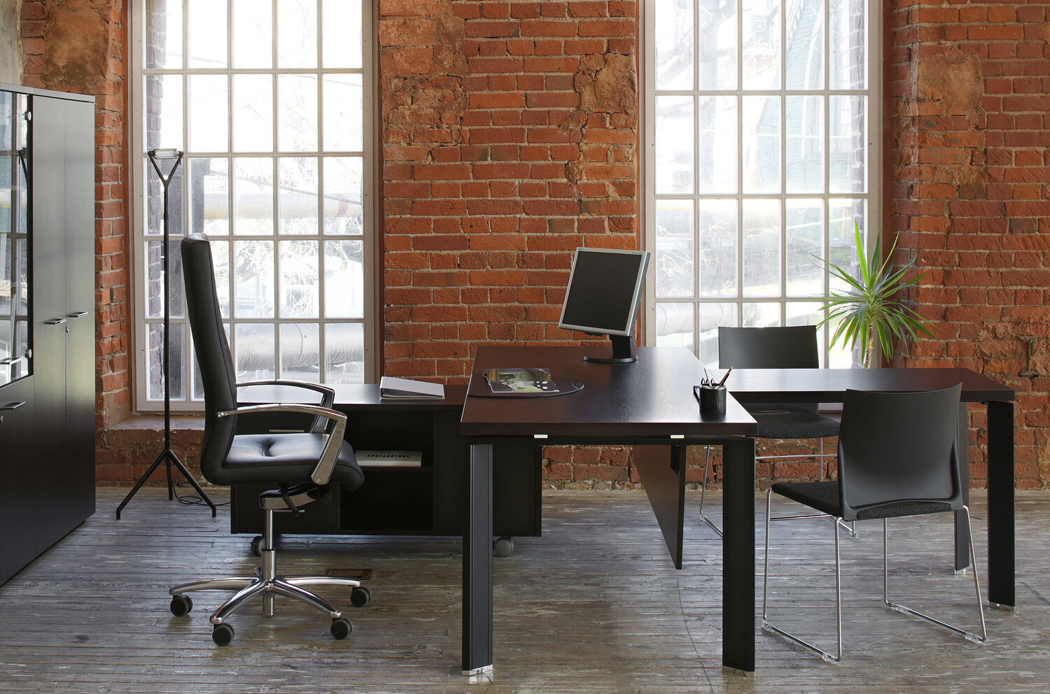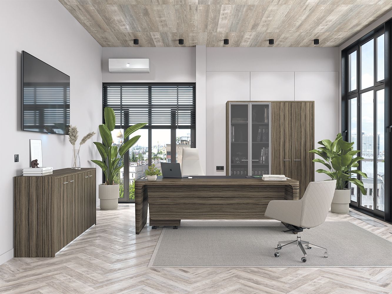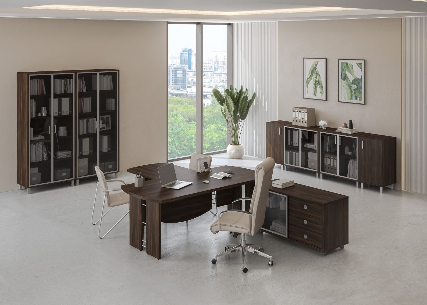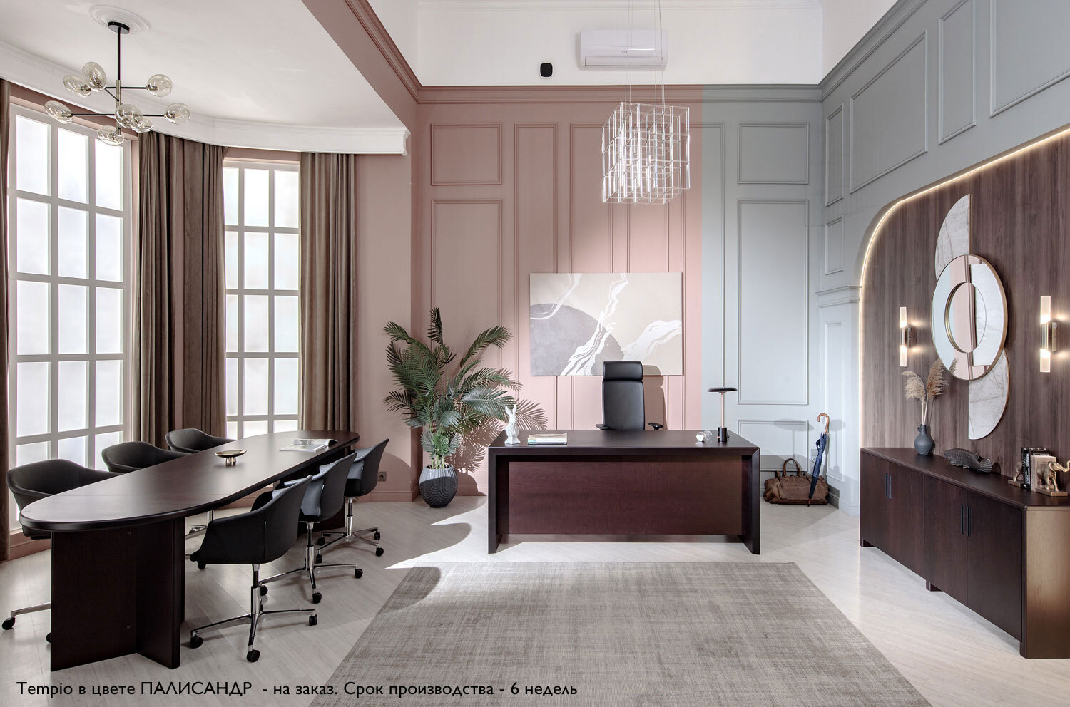 Конструкция элементов доведена до скульптурной четкости. Дизайн функционально обоснован и лаконичен. Прямые линии, массивные формы и интересные детали привнесут эстетику и значительность в интерьер вашего офиса.