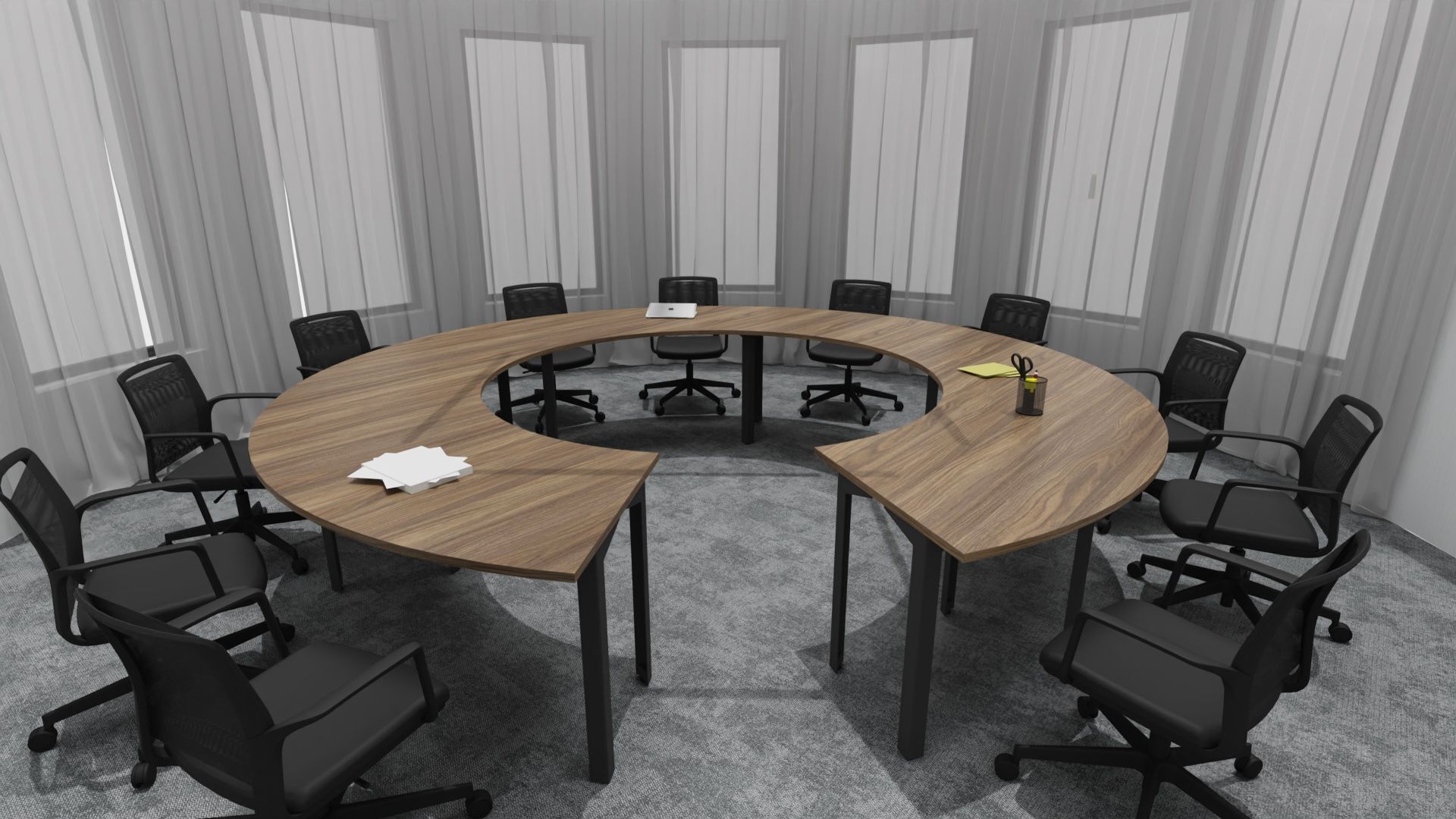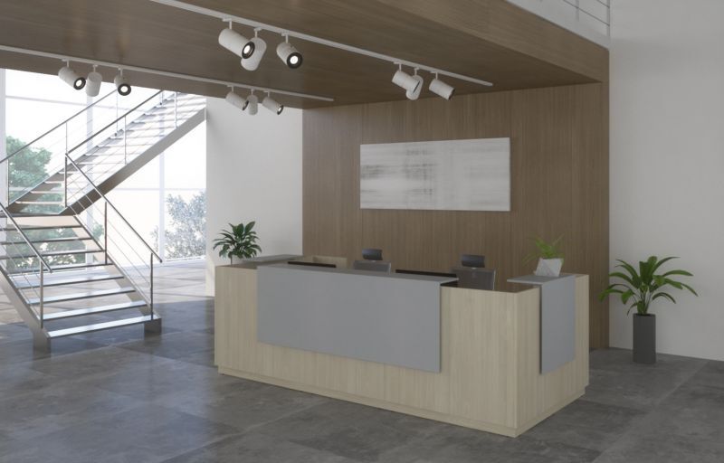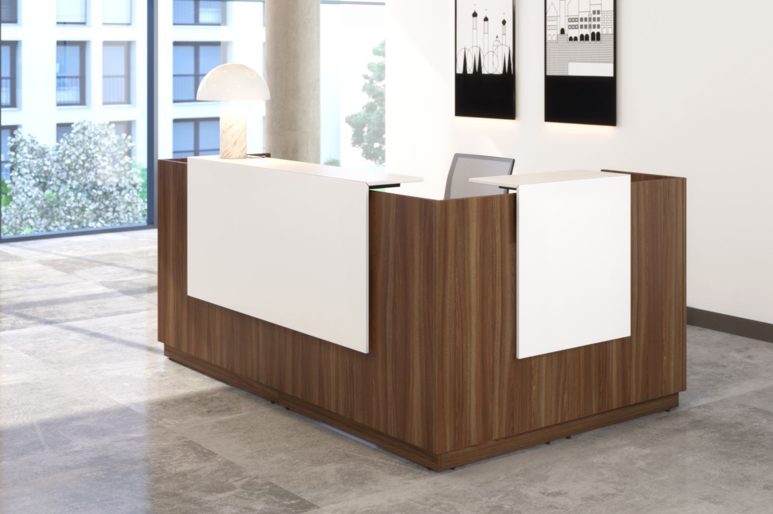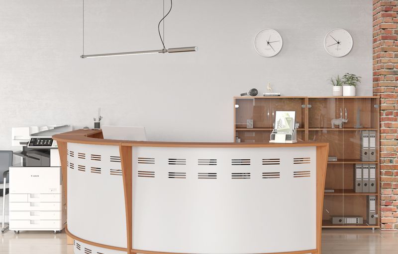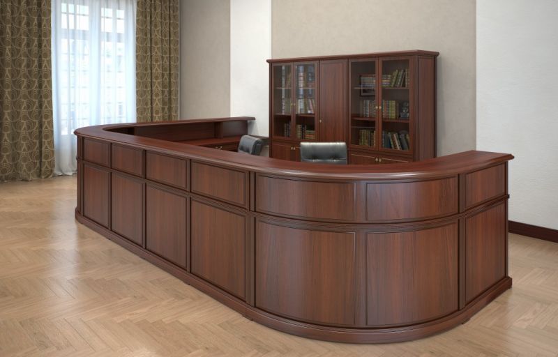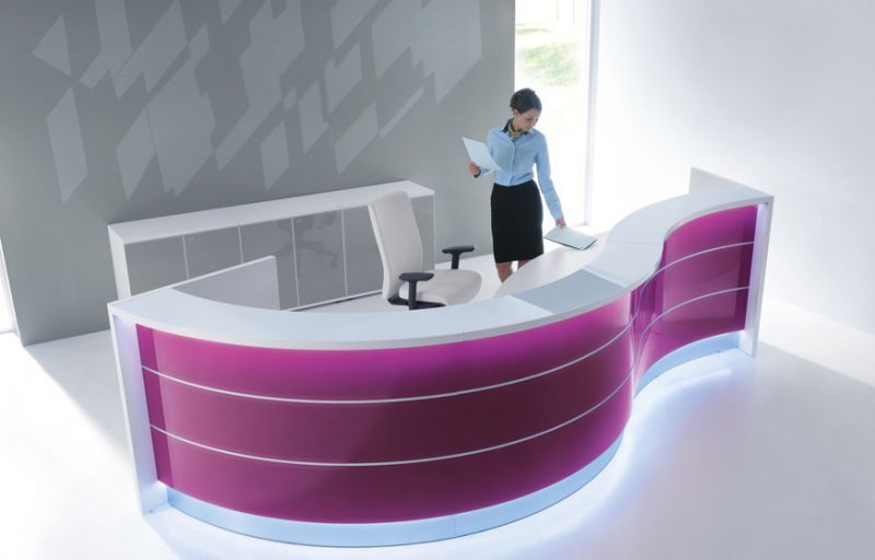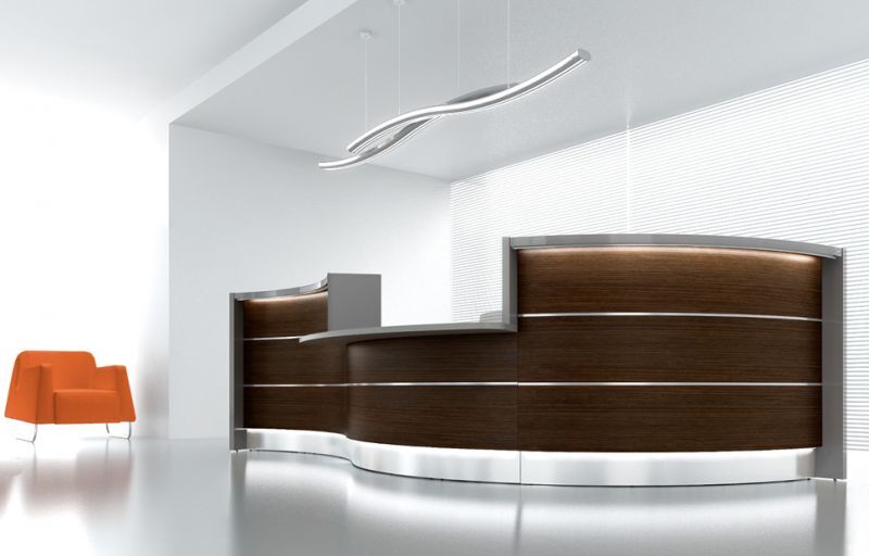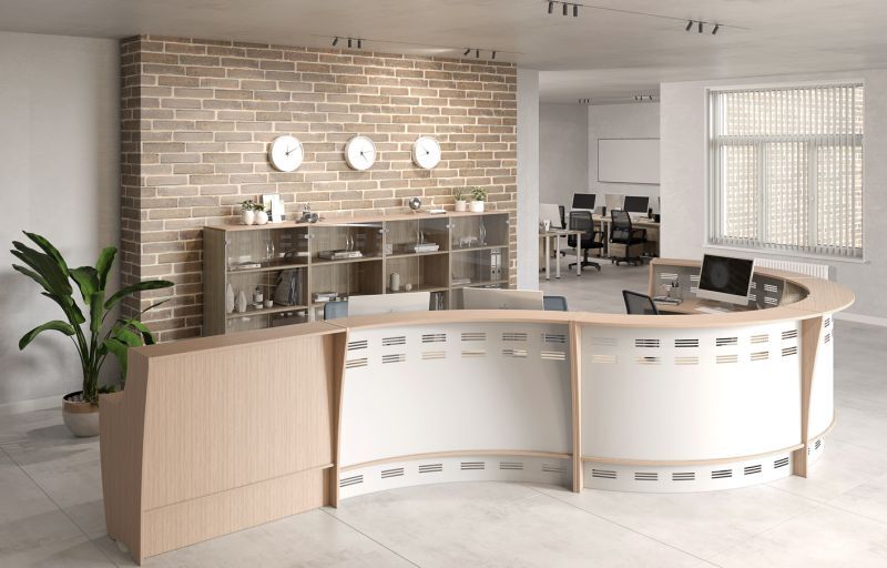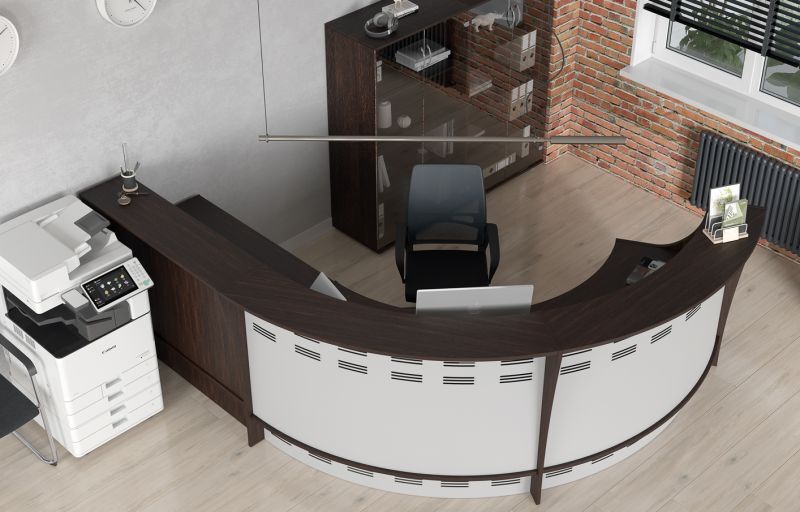 Стойка ресепшен — это центральный элемент зоны ресепшен. Благодаря наличию в радиальных секциях металлических экранов цвета «матовый алюминий» стойки ресепшен Формула идеально впишутся в современный офис, оформленный в стиле hi-tech. При разработке стойки ресепшен Формула специалисты учитывали не только модные тенденции в дизайне, но и эргономичность офисной мебели и безопасность работы офисного сотрудника.