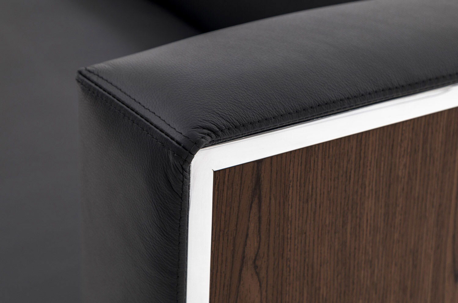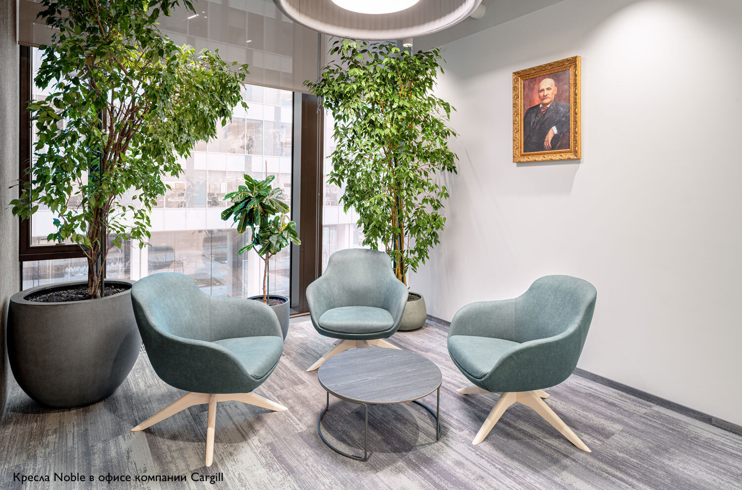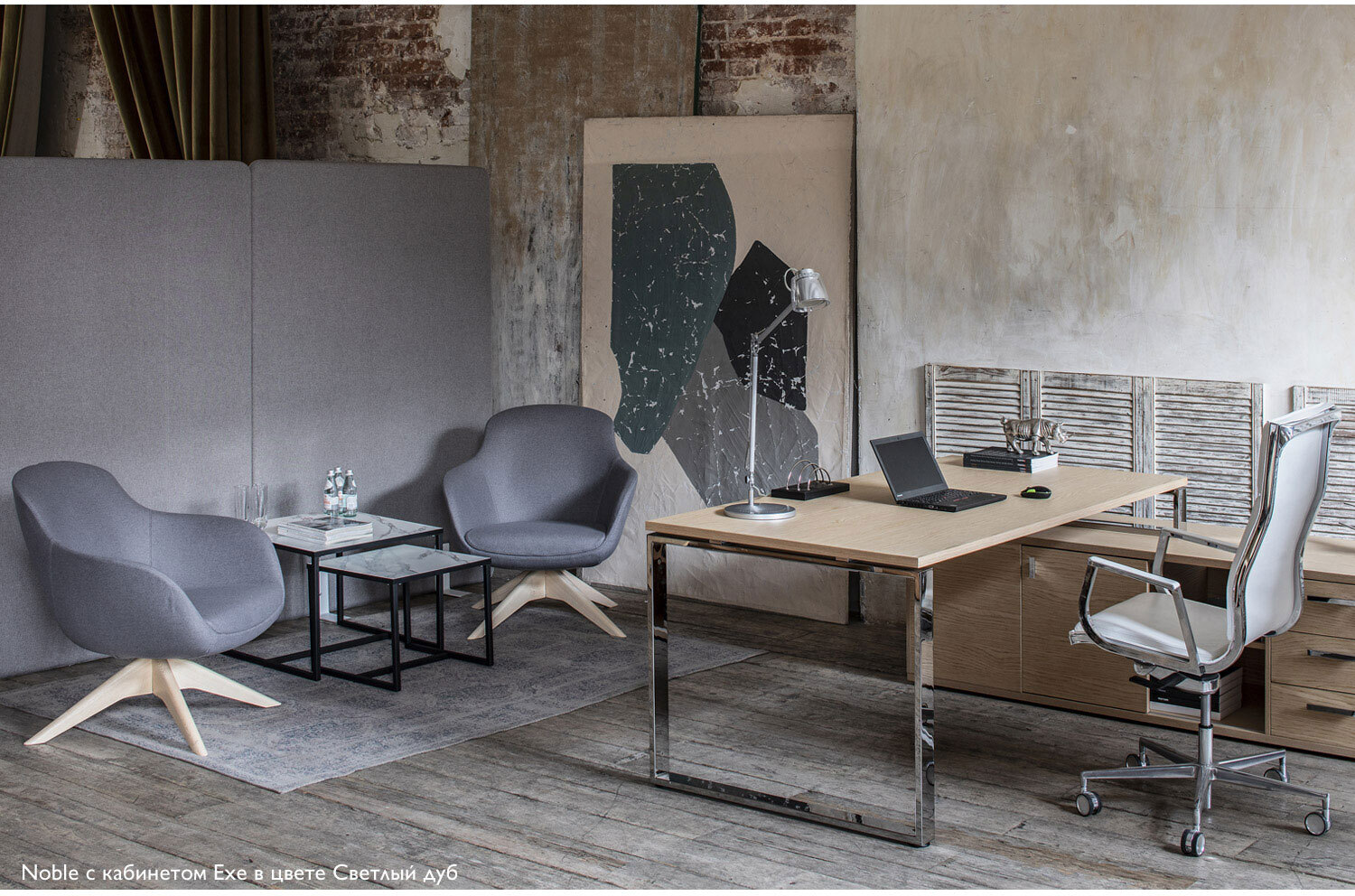 Noble является продолжением линейки Elegance. Формы и материалы коллекции перекликаются между собой, создавая элегантный и стильный ансамбль. Некрашеные деревянные опоры из массива ясеня созвучны с шерстяной обивкой благородного оттенка серого, а невысокая хромированная крестовина безукоризненно сочетается с черной кожей.