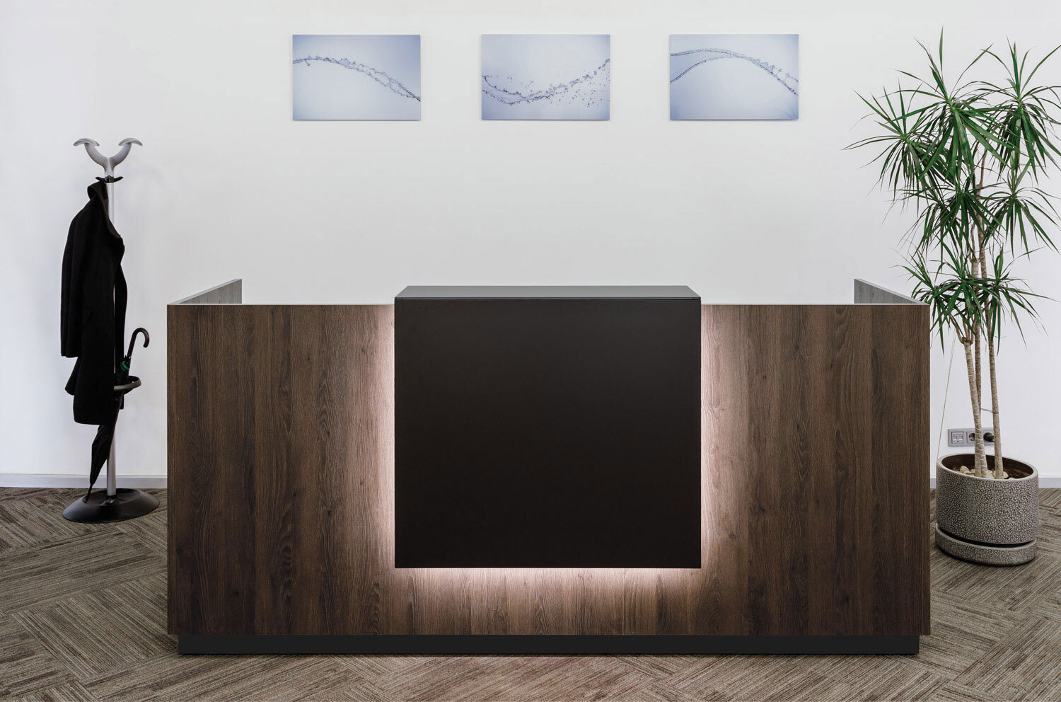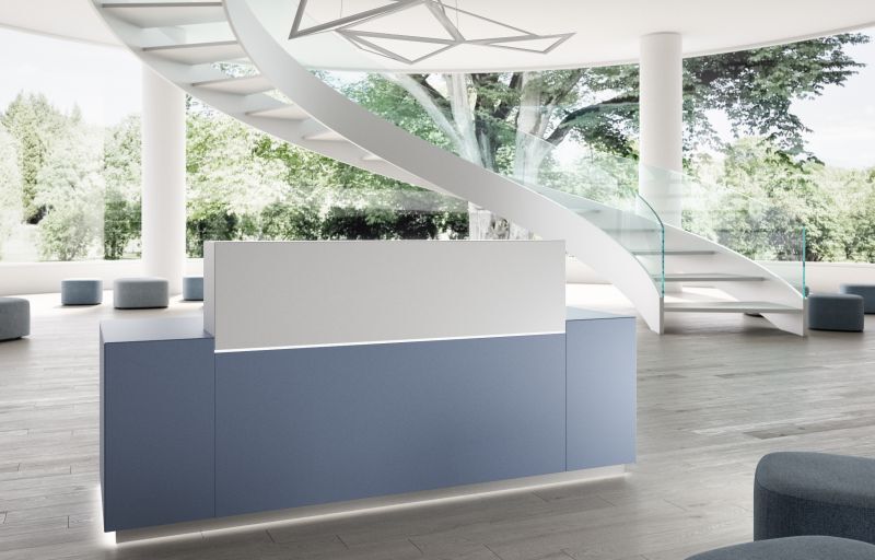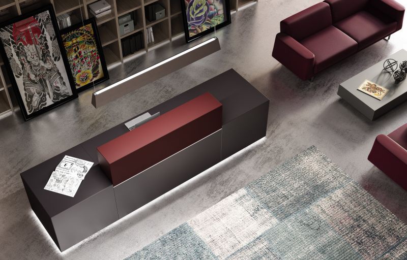 Z1 элегантный ресепшн с прямыми линиями и лакированными поверхностями. Две пересекающиеся поверхности, подсвеченные светодиодными лампами, обеспечивают визуальный эффект и зрительно разграничивают две рабочие зоны стойки. Подсветка является дополнительно опцией. Производство Италия.