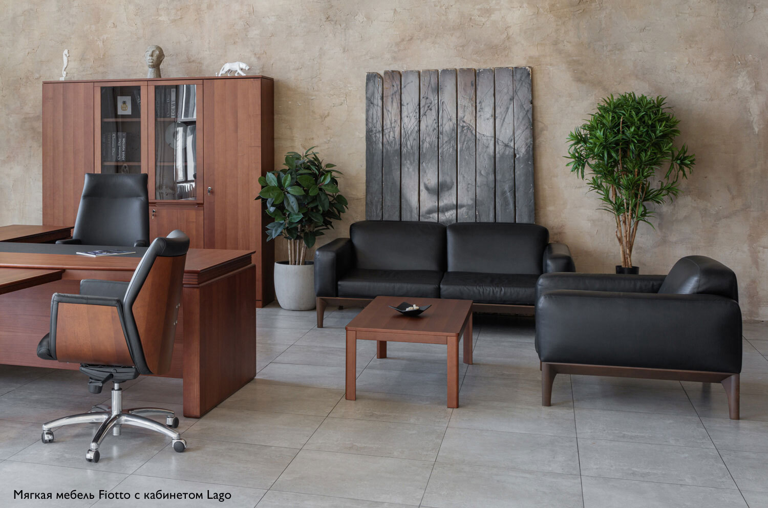 При создании коллекции Fiotto используются натуральный массив дерева и кожа — два материала, которые в традиционном представлении символизируют собой респектабельный офис. Отличительной чертой модели является сочетание широкого монолитного каркаса с изысканными высокими ножками, что визуально облегчает конструкцию.