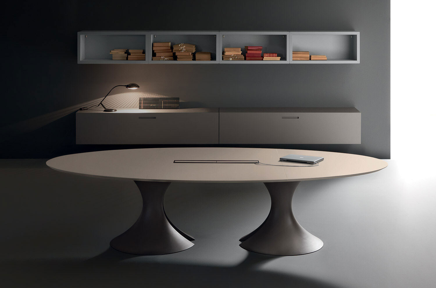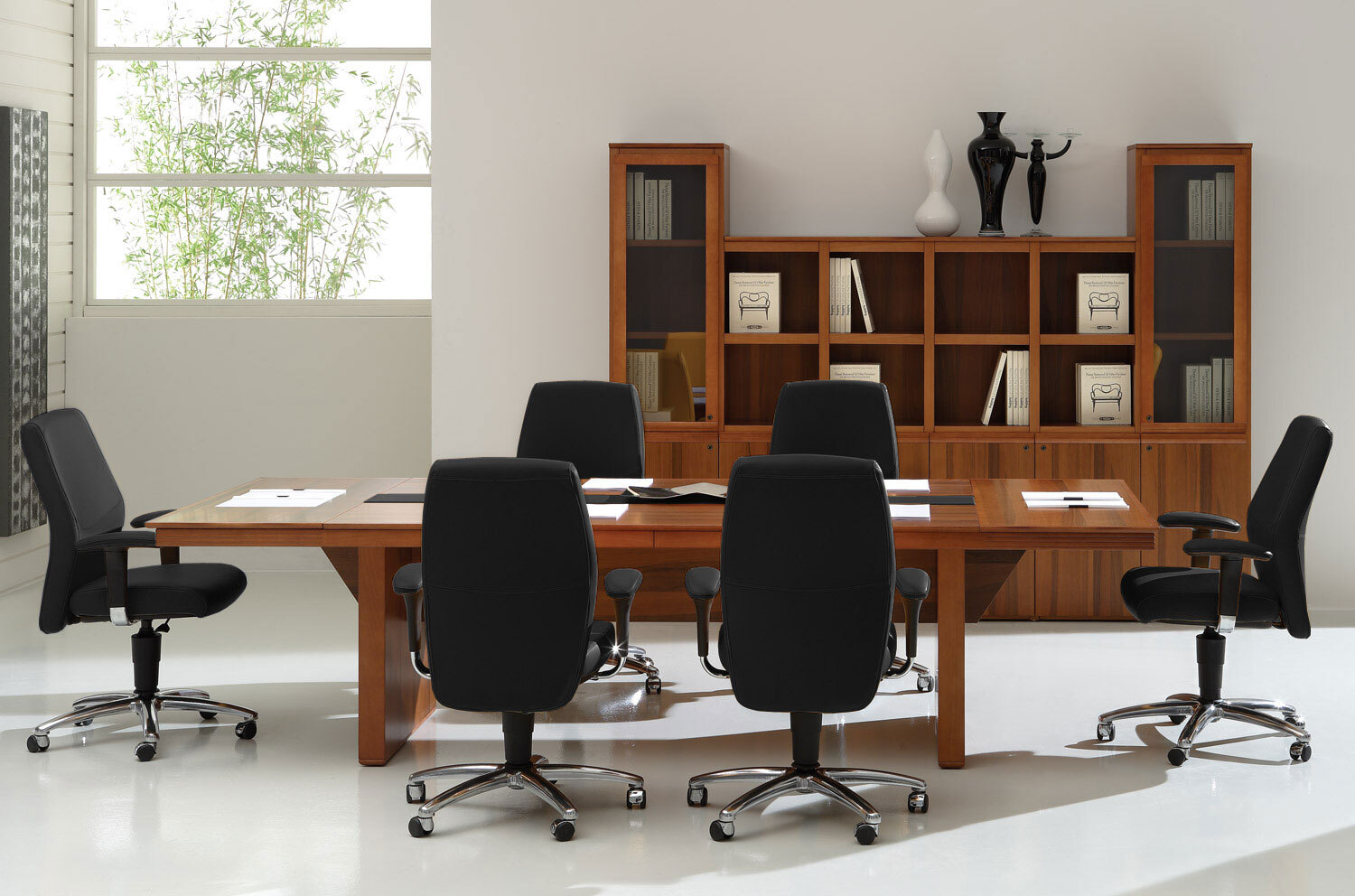 Kyo — это коллекция итальянской мебели для кабинетов и переговорных с дизайном от Марио Маццера (Mario Mazzer), в которой простые линейные формы преображаются за счет инновационных материалов и внушительной толщины элементов.