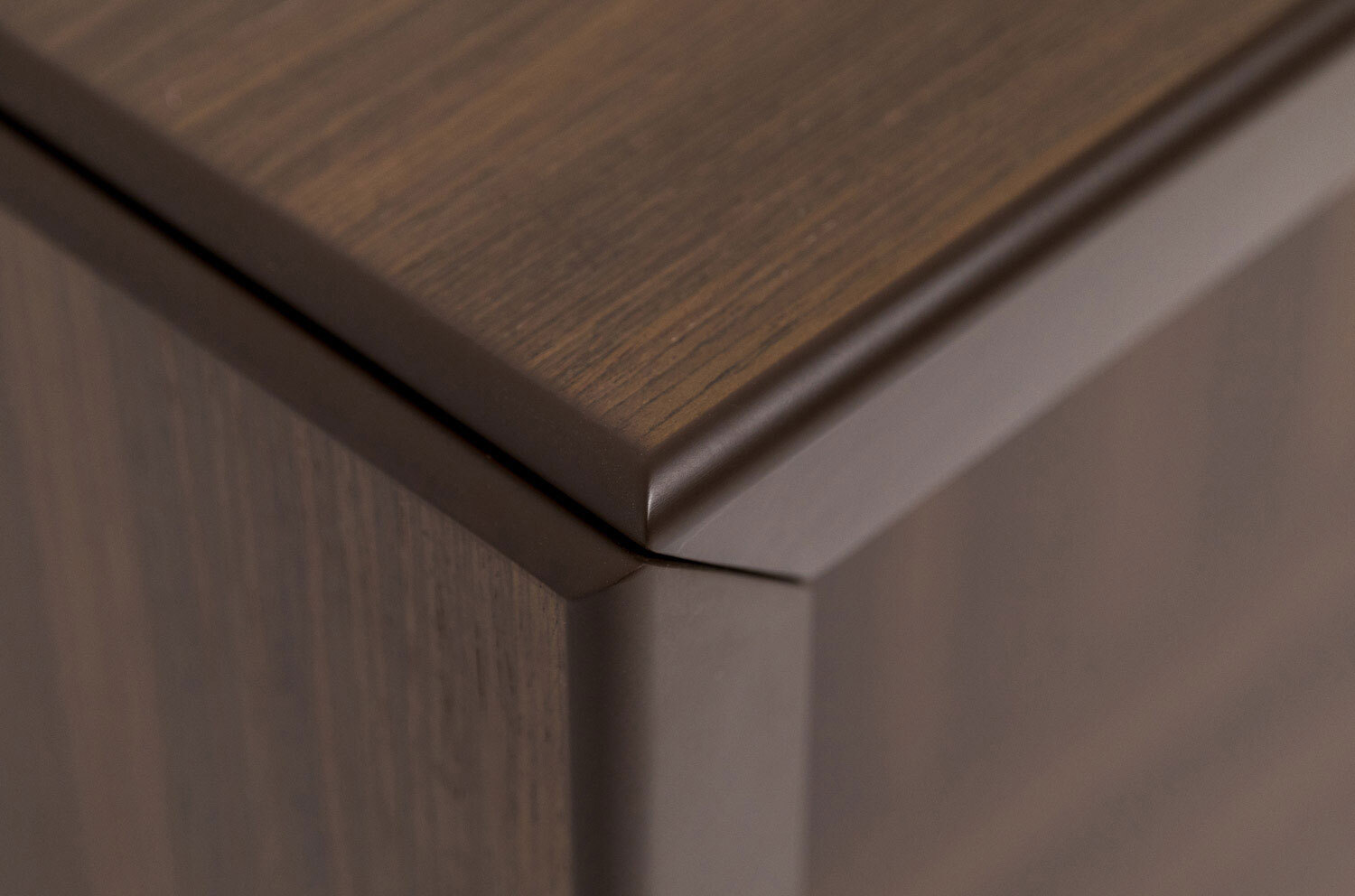 Толщина: столешниц столов для руководителей, брифинг-приставок – 75 мм, переговорных столов – 83 мм, переговорных столов на металлокаркасе - 26 мм, опор столов – 70 мм; топов шкафов – 33 мм, каркасов шкафов (за исключением полок), перегородок и полок тумб – 16 мм; каркасов тумб, фасадов – 17 мм; боковых декоративных панелей – 26 мм; полок шкафов – 25 мм.