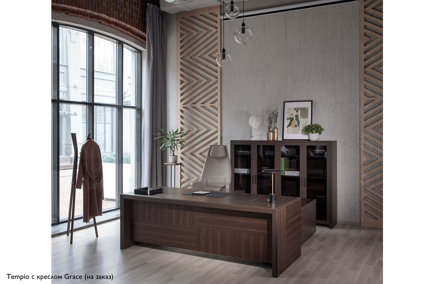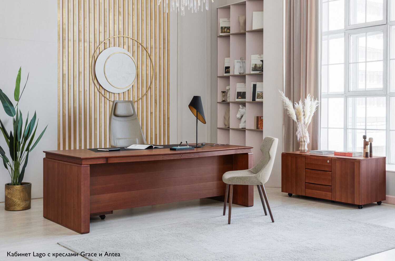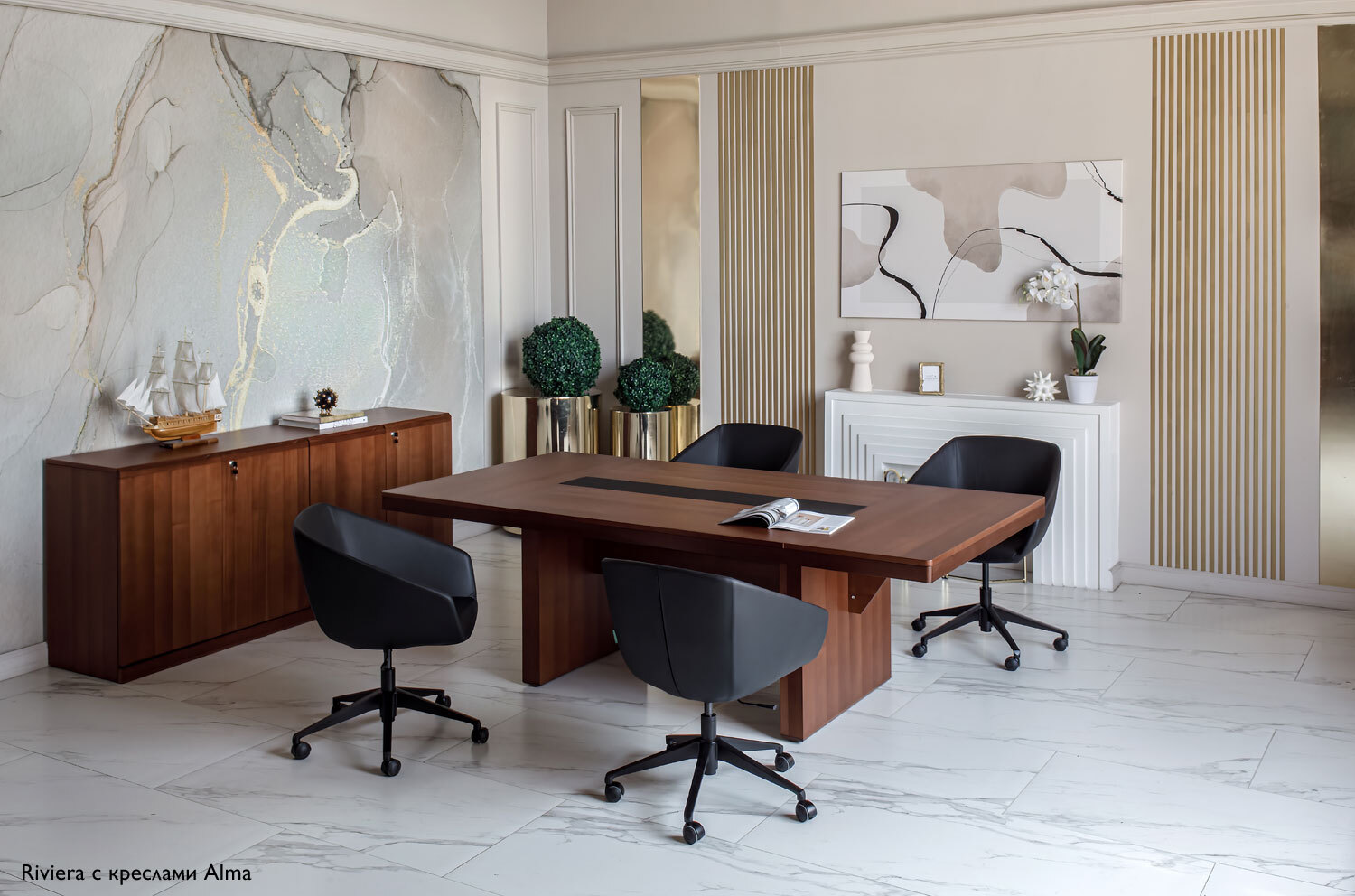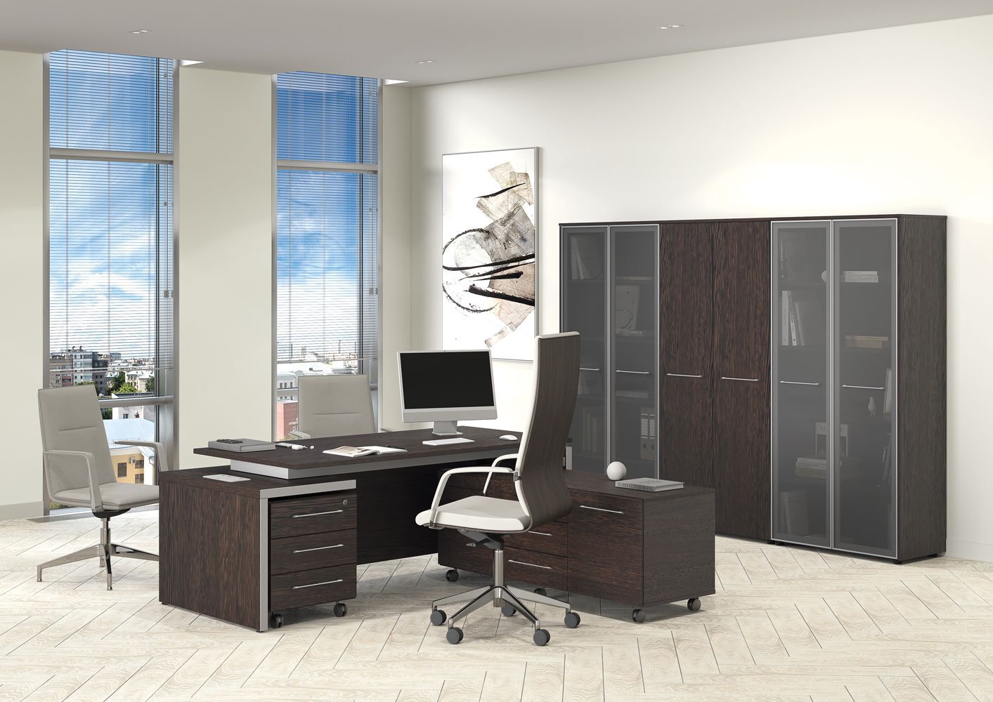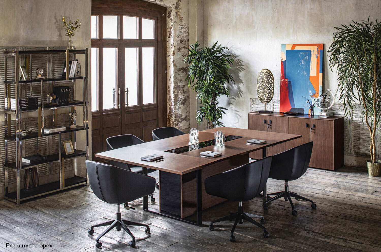 Конструкция элементов доведена до скульптурной четкости. Дизайн функционально обоснован и лаконичен. Прямые линии, массивные формы и интересные детали привнесут эстетику и значительность в интерьер вашего офиса.