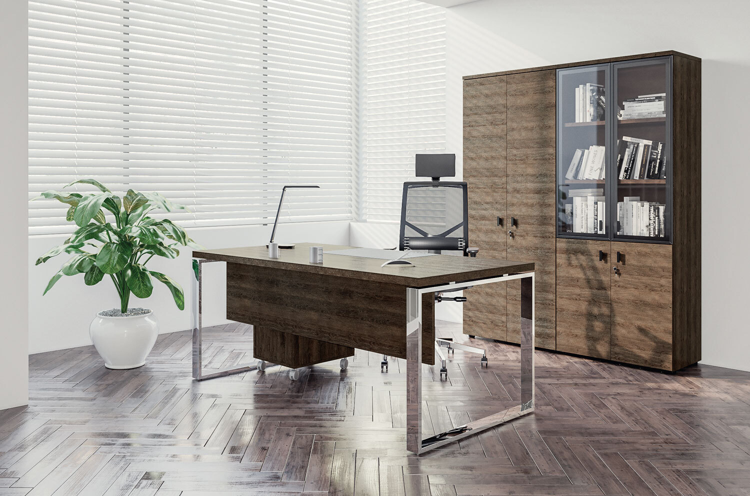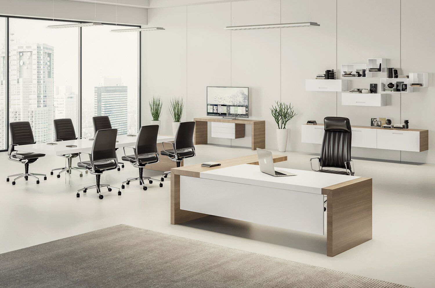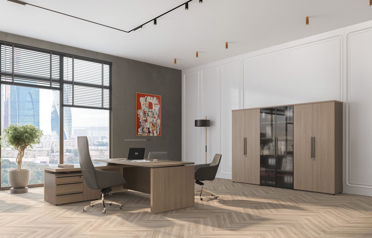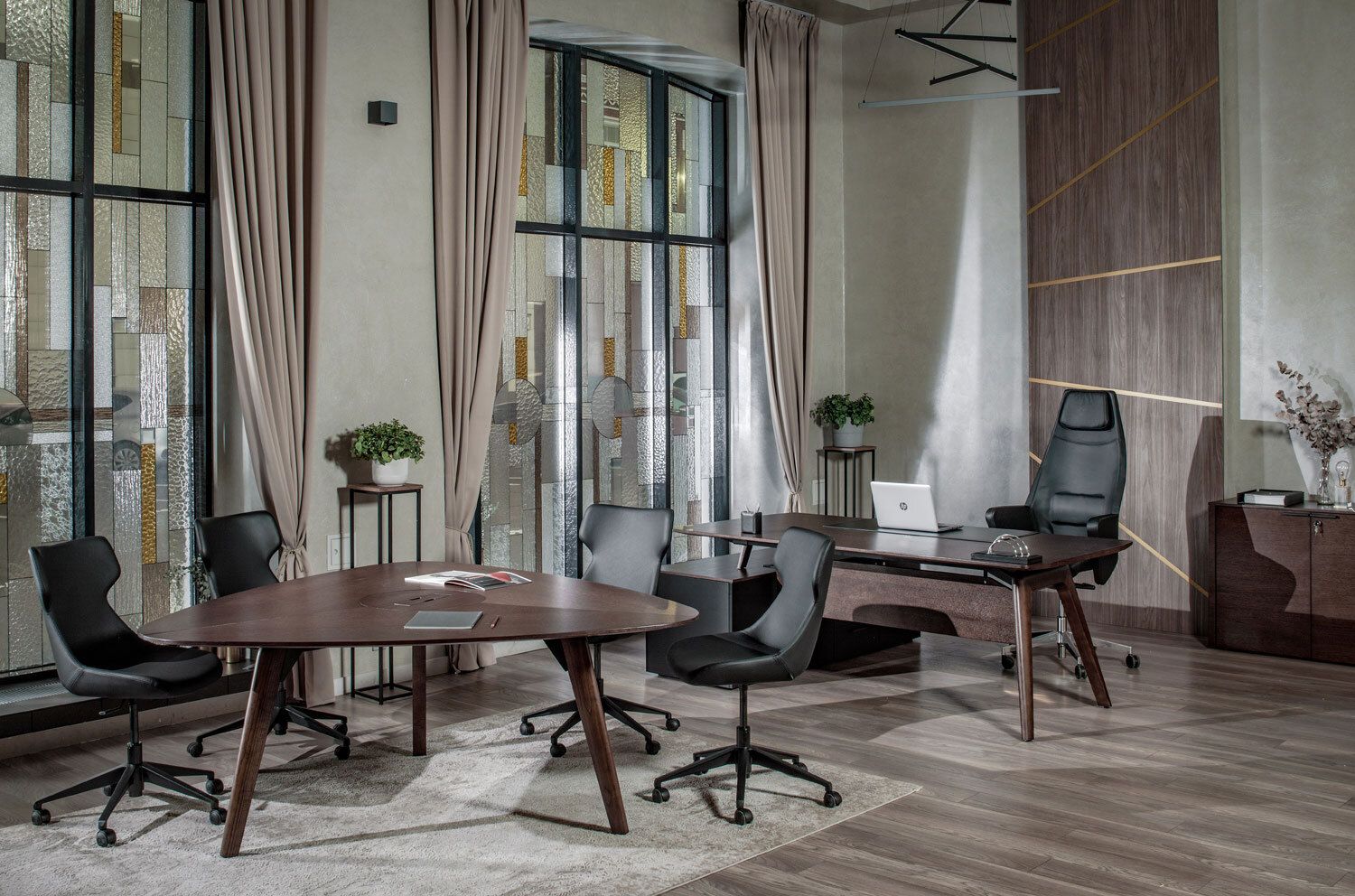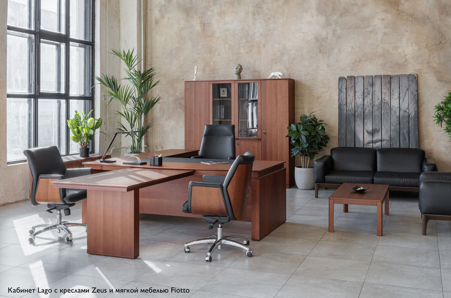 Конструкция элементов доведена до скульптурной четкости. Дизайн функционально обоснован и лаконичен. Прямые линии, массивные формы и интересные детали привнесут эстетику и значительность в интерьер вашего офиса.