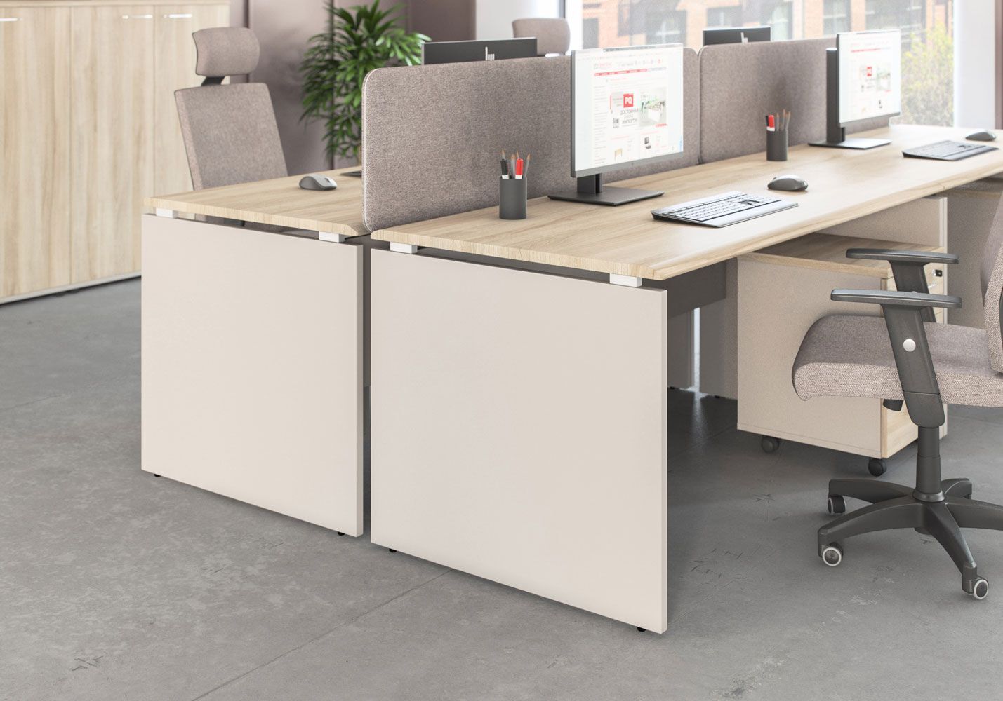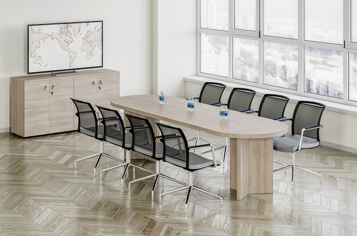Толщина: столешниц столов для руководителей, брифинг-приставок – 75 мм, переговорных столов – 83 мм, переговорных столов на металлокаркасе - 26 мм, опор столов – 70 мм; топов шкафов – 33 мм, каркасов шкафов (за исключением полок), перегородок и полок тумб – 16 мм; каркасов тумб, фасадов – 17 мм; боковых декоративных панелей – 26 мм; полок шкафов – 25 мм.