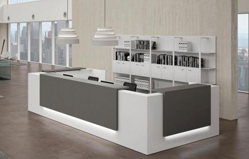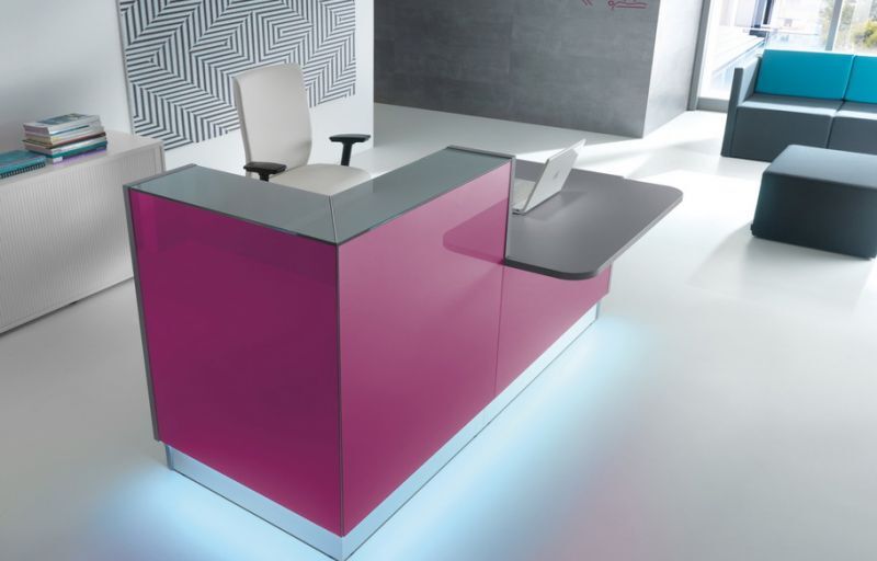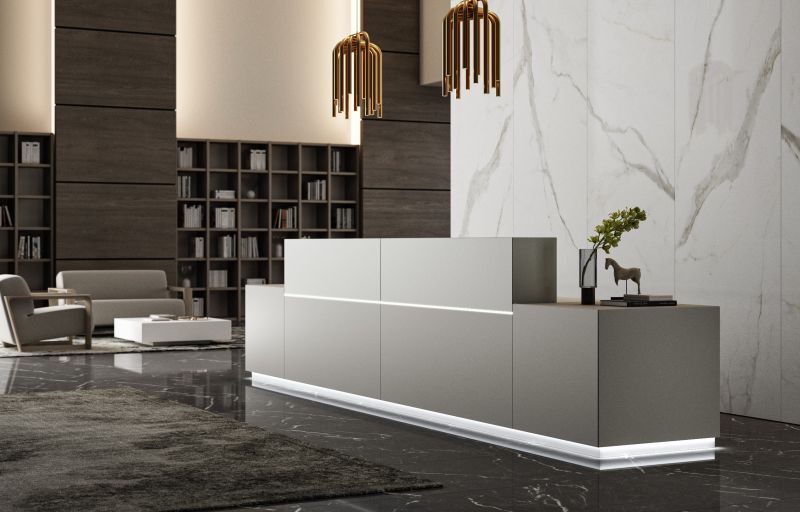 Z1 элегантный ресепшн с прямыми линиями и лакированными поверхностями. Две пересекающиеся поверхности, подсвеченные светодиодными лампами, обеспечивают визуальный эффект и зрительно разграничивают две рабочие зоны стойки. Подсветка является дополнительно опцией. Производство Италия.