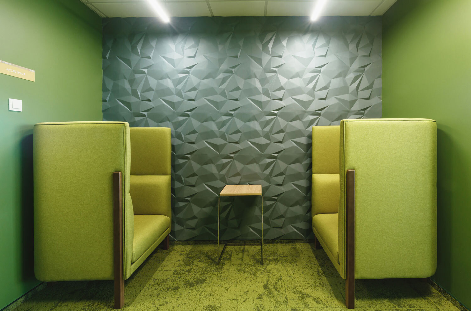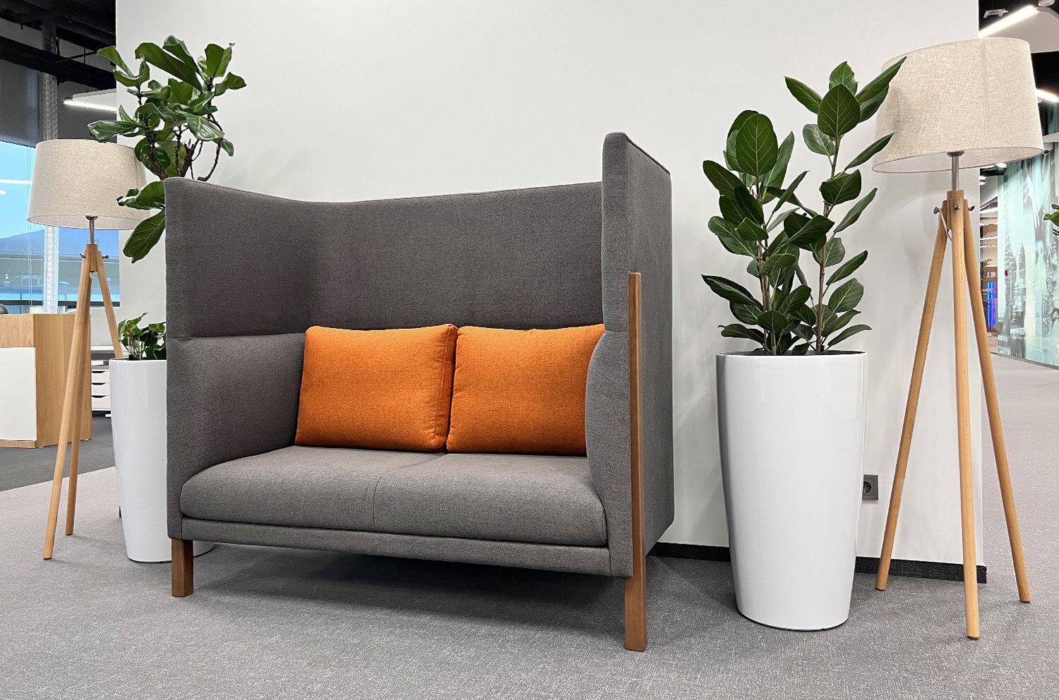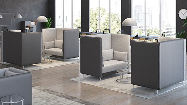 Достаточно большая высота спинки (почти 1,4 м) обеспечивает визуальную неприкосновенность частной жизни и подавляет окружающий шум, позволяя спокойно сосредоточиться на деловой беседе или уединенной работе.